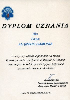 Jestem dumna, że przez wiele lat byłam żoną mojego kochanego Alka. Wiele razem przeżyliśmy i wiele się od Niego nauczyłam. Cieszę się, że marzenie mojego męża właśnie się spełniło. Dzięki Funduszowi czuję, że Alek, choć odszedł, to jest stale blisko nas. Dzięki Funduszowi – Alojzy Gamoń, znany i popularny żorzanin, polski patriota, a jednocześnie świadomy Ślązak, zasłużony dla regionu nie musi czekać na swój pomnik ze spiżu. Jego życiowe dokonania, a dziś także Fundusz, budują Jego pomnik, trwalszy, bo przechowywany w ludzkiej pamięci.