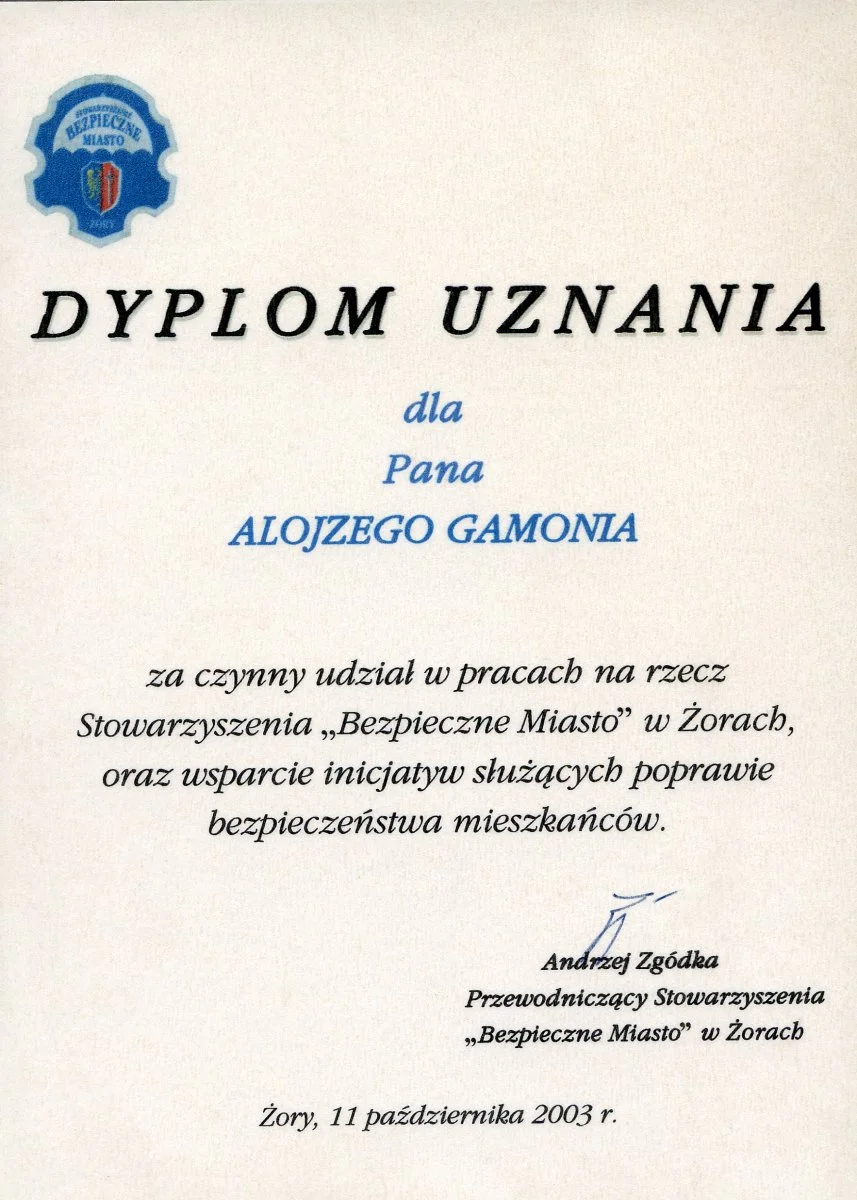 Jestem dumna, że przez wiele lat byłam żoną mojego kochanego Alka. Wiele razem przeżyliśmy i wiele się od Niego nauczyłam. Cieszę się, że marzenie mojego męża właśnie się spełniło. Dzięki Funduszowi czuję, że Alek, choć odszedł, to jest stale blisko nas. Dzięki Funduszowi – Alojzy Gamoń, znany i popularny żorzanin, polski patriota, a jednocześnie świadomy Ślązak, zasłużony dla regionu nie musi czekać na swój pomnik ze spiżu. Jego życiowe dokonania, a dziś także Fundusz, budują Jego pomnik, trwalszy, bo przechowywany w ludzkiej pamięci.